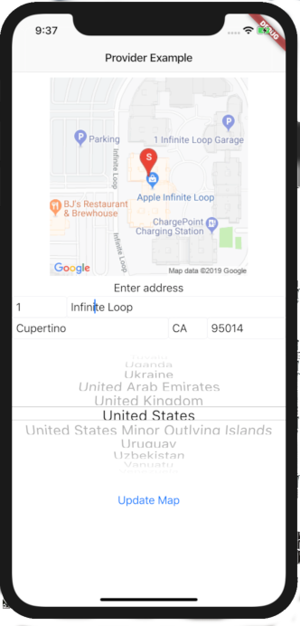 There you have it, the components are wired up. The AddressBox widget can now pass information to the MapWidget for the purpose of updating the map widget’s state. To wrap up, the ChangeNotifierProvider holds references to any registered ChangeNotifier. All widgets in the ChangeNotifierProvider tree can make a call to one of the configured ChangeNotifier objects through a call to Provider